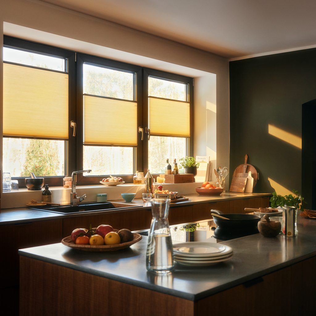 Ergänzt durch innenliegende Wabenplissees für sanfte Lichtsteuerung und Wärmeschutz.